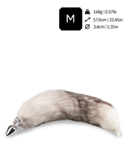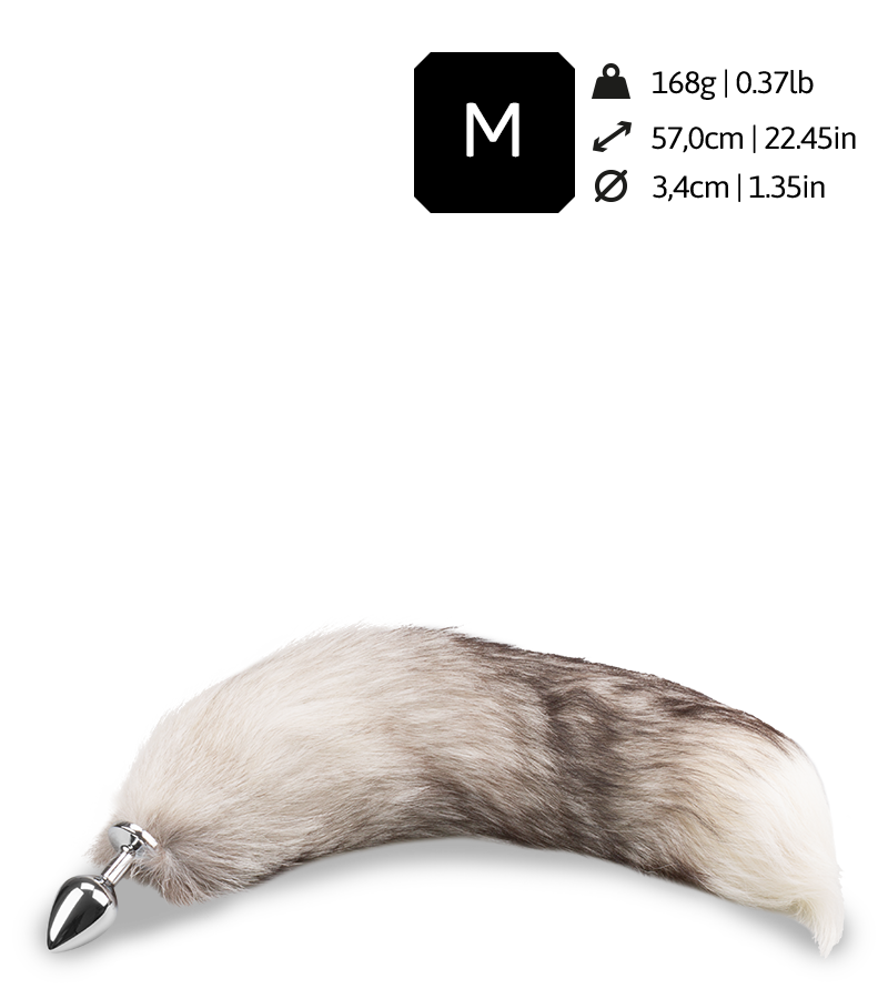 Der grau-weiße Fuchsschwanz-Buttplug mit echtem Fell ist insgesamt 57 cm lang. Der Fuchsschwanz misst ohne Plug eine Länge von 47 cm. Der Metall-Plug hat eine einführbare Länge von 6,7 cm und einen Durchmesser von 3,4 cm.