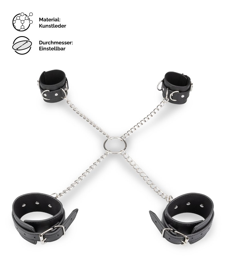 Die Kreuzfessel mit den vier verschließbaren Manschetten lässt Sie eine neue Facette des erotischen Spiels entdecken. Die vier Fesseln fixieren Hand- und Fußgelenke, sodass Sie sich nur noch sehr eingeschränkt bewegen können. Der O-Ring, an dem die vier Ketten der Hand- und Fußfesseln zusammenlaufen, kann sich dabei auf der Vorder- oder auf der Rückseite des Körpers befinden. Je nachdem, welche Stellungen Sie bei Ihren BDSM-Spielen bevorzugen. Die maximale Distanz zwischen zwei Fesseln liegt bei 40 cm. Ihre Bewegungsfreiheit wird also deutlich eingeschränkt. Im Lieferumfang sind zwei Schlüsselsätze enthalten, mit denen Sie die Schlösser an den vier Fesseln jeweils auf- und abschließen können. Zur Vervollständigung des Looks empfehlen wir Ihnen das richtige Outfit aus unserem Shop. Wenn Sie auf Lack und Leder stehen, dann finden Sie bei uns schwarz glänzende BDSM-Outfits oder Dessous im Wetlook!