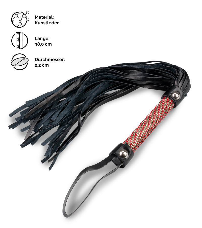 Die kleine Riemenpeitsche mit Strass hat eine Gesamtlänge (ohne Schlaufe) von 38 cm. Die Riemen sind 24 cm lang und der Griff hat einen Durchmesser von 2,2 cm.