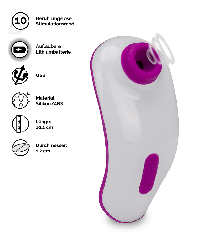 Halten Sie einfach den kleinen Aufsatz aus Silikon an Ihre Klitoris und genießen Sie die sanften Schwingungen und Druckwellen. Ohne die Klitoris direkt zu berühren sorgt dieses Sexspielzeug mit Druckwellen und Schwingungen für unvergessliche Empfindungen! Um sich an die Wünsche aller Frauen anzupassen, die mal zärtlich sanft und mal intensiv berührt werden möchten, bietet Ihnen dieser Druckwellenstimulator eine Auswahl von 10 Intensitätsstufen. Der Druckwellenstimulator ist klein und leicht und folgt Ihnen überall dorthin, wo Sie lustvolle Momente erleben möchten. Wenn er schwächelt können Sie ihn mit dem mitgelieferten USB-Magnetladekabel wieder aufladen.