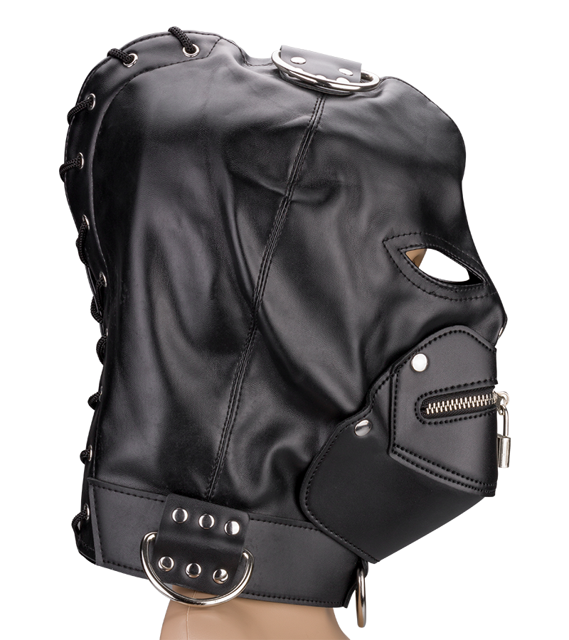 Die Kopfmaske aus Kunstleder hat zwei Öffnungen für die Augen und eine Öffnung für den Mund. Letztere ist mit einem Reißverschluss versehen, sodass Sie die Öffnung nach Belieben öffnen und schließen können. Mit dem kleinen Schloss lässt sich der Reißverschluss sogar so schließen, dass niemand ihn öffnen kann - außer der Person, die den passenden Schlüssel besitzt. Vier Ringe, davon drei am Hals und einer oben am Kopf, dienen als Befestigung für weiteres BDSM-Zubehör, wie Leine, Haken oder Fesseln. Für eine optimale Passform sorgt der Verschluss in Form einer Schnürung am Hinterkopf.