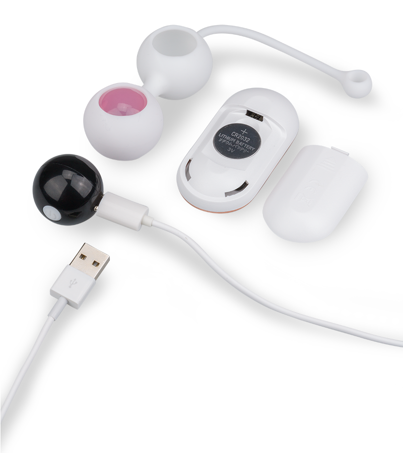 Das Set enthält insgesamt fünf verschiedene Kugeln, von denen eine vibriert und ferngesteuert werden kann. Außerdem sind zwei Halterungen aus medizinischem Silikon enthalten, in die Sie entweder eine oder zwei der Kugeln positionieren können. Die Kugeln sind unterschiedlich schwer, sodass Sie Ihr Beckenbodentraining individuell gestalten und steigern können. Wenn Sie die Kegelübungen noch mehr genießen möchten, sollten Sie die vibrierende Kugel einlegen. Mit der kabellosen Fernbedienung können Sie dann, wenn Sie soweit sind, die Vibrationsfunktion starten und einen der 9 vorhandenen Modi auswählen. Im Lieferumfang sind ein USB-Ladekabel zum Aufladen der vibrierenden Kugel und eine Batterie für die Fernbedienung enthalten.