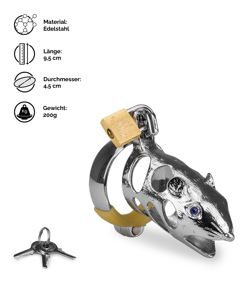 Der Keuschheitsgürtel mit chinesischem Sternzeichen Ratte ist 9,5 cm lang. Der Durchmesser des Rings misst 4,5 cm. Im Lieferumfang sind ein Schloss und ein Schlüsselsatz bestehend aus 3 Schlüsseln enthalten.