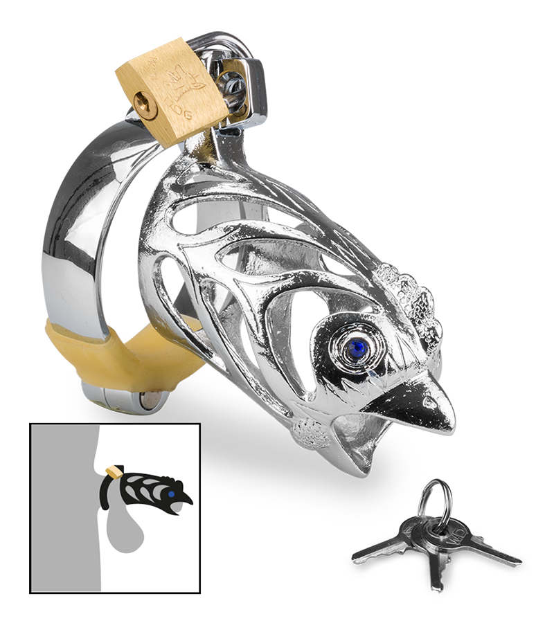 Der Peniskäfig aus robustem Edelstahl macht eine Erektion unmöglich. Durch die kleinen Öffnungen an der Seite und vorne kann der Penis aber dennoch sanft stimuliert werden. Auch Urinieren ist möglich. Somit kann der Keuschheitsgürtel auch über einen längeren Zeitraum getragen werden. So lange, bis das kleine Schloss wieder aufgeschlossen und Ihr Penis aus seinem Gefängnis befreit wird. Der Peniskäfig hat ein originelles Design im Stil des chinesischen Tierkreiszeichens Hahn.