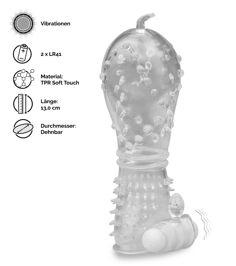 Die transparente Penishülle mit Noppen und Vibration ist 13 cm lang und aus Silikon gefertigt. Das Material ist dehnbar und passt sich unterschiedlichen Penisdurchmessern an. Das mitgelieferte Vibro-Bullet ist batteriebetrieben. Die erforderlichen beiden LR41-Batterien sind ebenfalls im Lieferumfang enthalten.