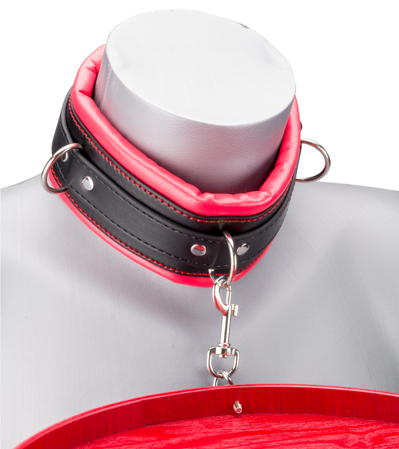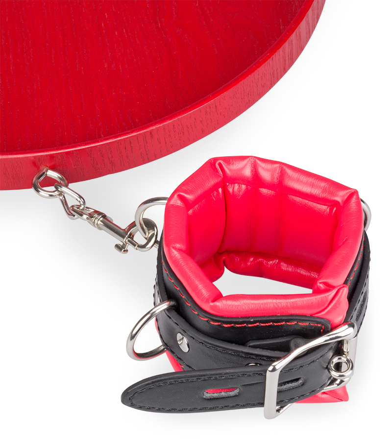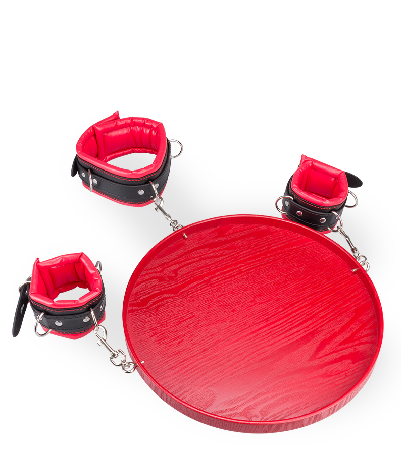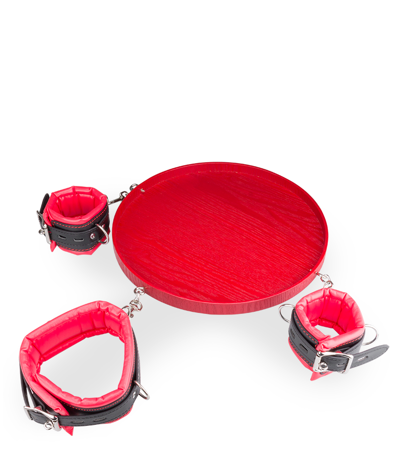 Dieses BDSM-Accessoire besteht aus zwei Fesseln für die Handgelenke und einem Halsband. Handfesseln und Halsband sind an einem Holztablett befestigt. So zwingen Sie Ihren Partner oder Ihre Partnerin dazu, Sie zu bedienen. Die Handfesseln und das Halsband sind aus Kunstleder hergestellt, auf der Innenseite weich gepolstert und in der Größe verstellbar.