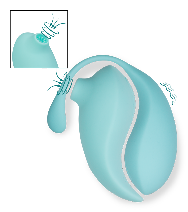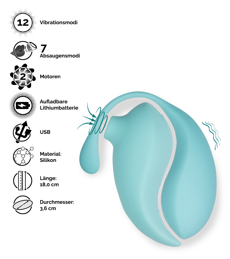 Das Vibroei ist perfekt geformt. Es schmiegt sich für genussvolle Massagen an Ihren G-Punkt und versorgt diese erogene Zone mit kribbelnden Vibrationen in 12 Modi. Und weil doppelt immer besser hält gibt es zu diesem Vibroei eine kabellose Fernbedienung dazu, die auf Ihren Wunsch sanft an der Klitoris saugt. Der Aufsatz des Klitorissaugers ist mit kleinen weichen Silikonnoppen versehen, die an der Klitoris kitzeln. Wenn Sie auf die Stimulation der Klitoris verzichten können und lieber Ihren Partner oder Ihre Partnerin in Ihr lustvolles Spiel einbeziehen möchten, können Sie die Fernbedienung mit Klitorissauger auch abgeben und sich von fremdbestimmten Vibrationen überraschen lassen.